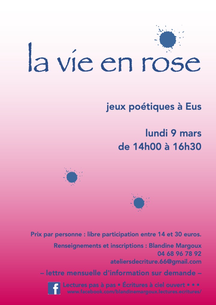 En atelier d'écriture, chacun et chacune peut à loisir découvrir sa part poétique, son espace de construction, ses émotions enfouies. Il n'y a pas de jugement, ni d'objectif à atteindre. Le groupe est guidé à travers mini-conférences, discussions, textes lus et partagés, images stimulantes, écoute respectueuse. Ce qui donne le ton, c'est le plaisir d'être ensemble, de se dire, de se lire et de s'entendre, et puis de découvrir des auteur·e·s et artistes. Participer à un atelier d'écriture, c'est en général être étonné·e et content·e de soi, de sa créativité présente et à venir.