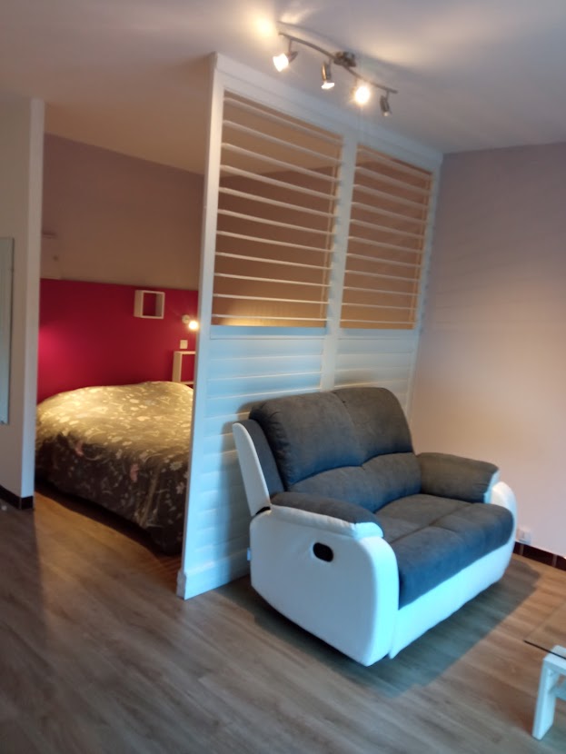 Chambre : lit 2 personnes, séparée du salon par cloison persienne, occultant.