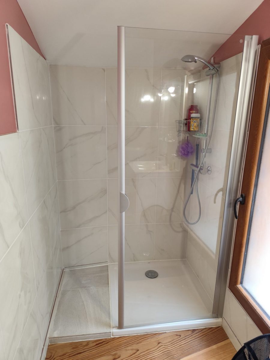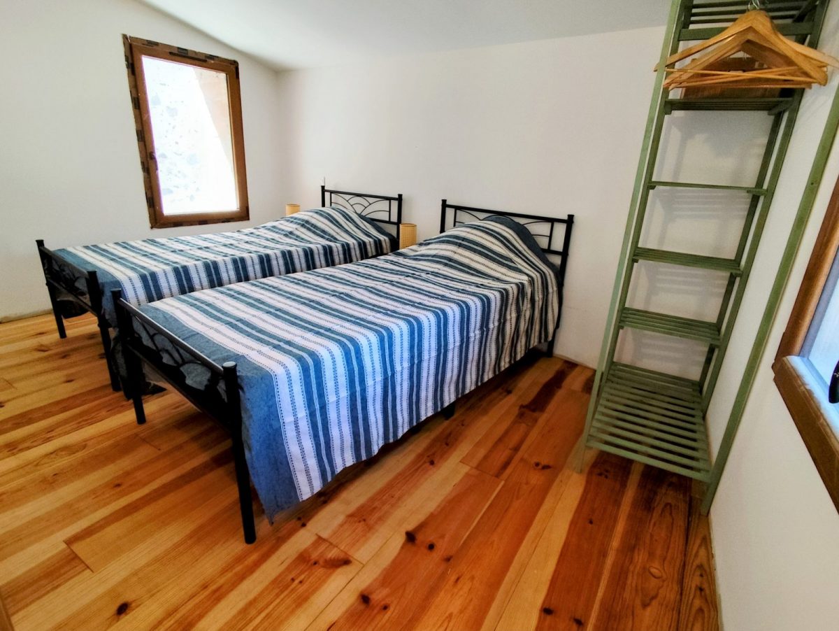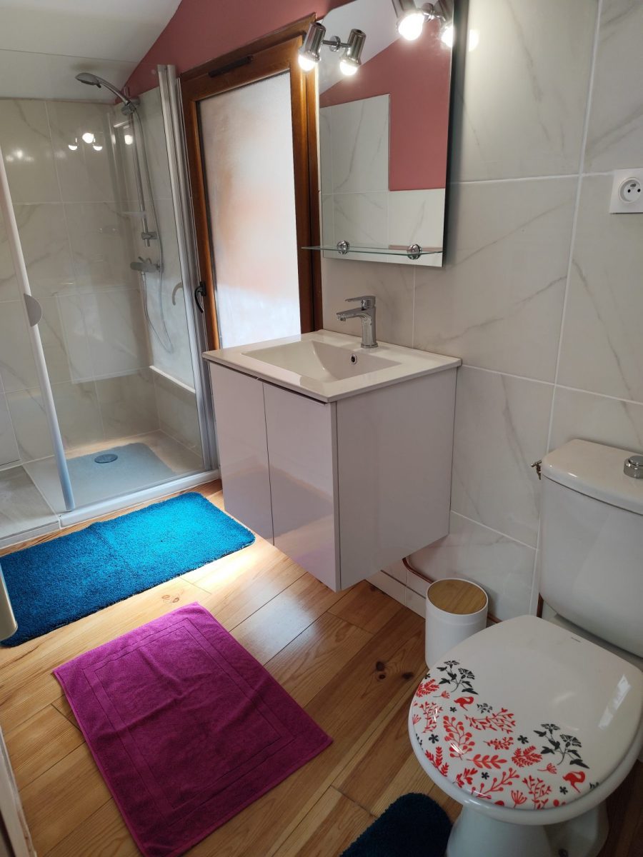À l'étage, 2 chambres, l'une avec un lit double, l'autre avec 2 lits simples. La salle de bain est équipée d'une douche et de WC.