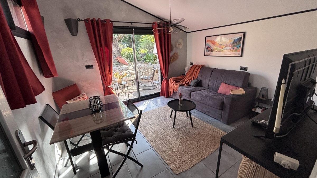 - d’une pièce de vie, comprenant un coin salon avec un canapé convertible 2 personnes, une Smart TV