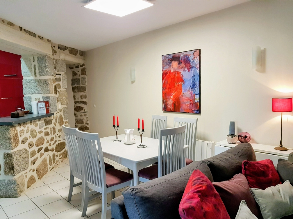 Partie de maison de caractère en pierres avec terasse et jardin, place de parking. Vue Canigou, Grand séjour avec cheminée et cuisine trés bien équipée, 2 chambres avec 2 salles d'eau complètes, Buanderie.