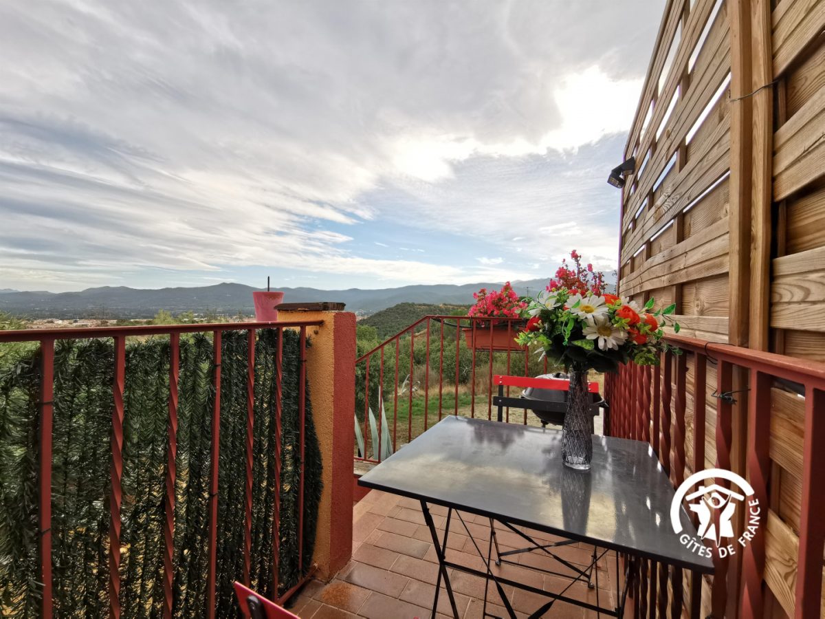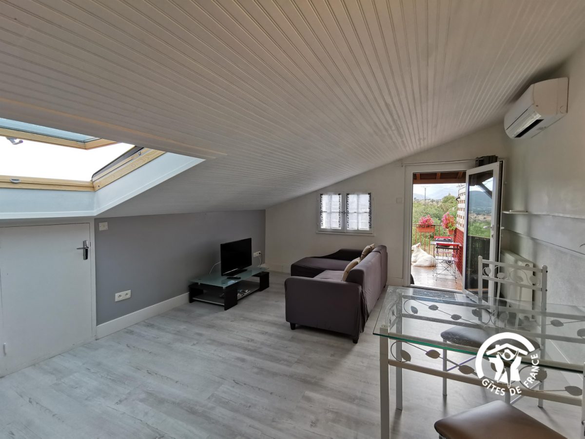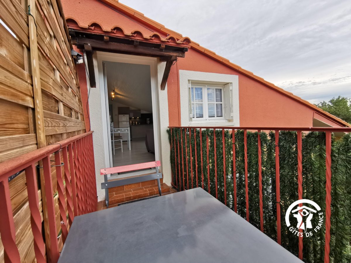 Ce gîte pour 2 personnes est au 1 étage, sous les toits en sous-pentes : séjour avec coin cuisine équipée, 1 chambre (2 lits 1 pers), salle d'eau, wc. Une petite terrasse privative permet de déjeuner face aux Pyrénées. Une piscine chauffée est à partager avec les 2 autres gîtes (dimensions : 11 x 5 m – sécurisée par une clôture). Le site est entouré de garrigue et au calme.