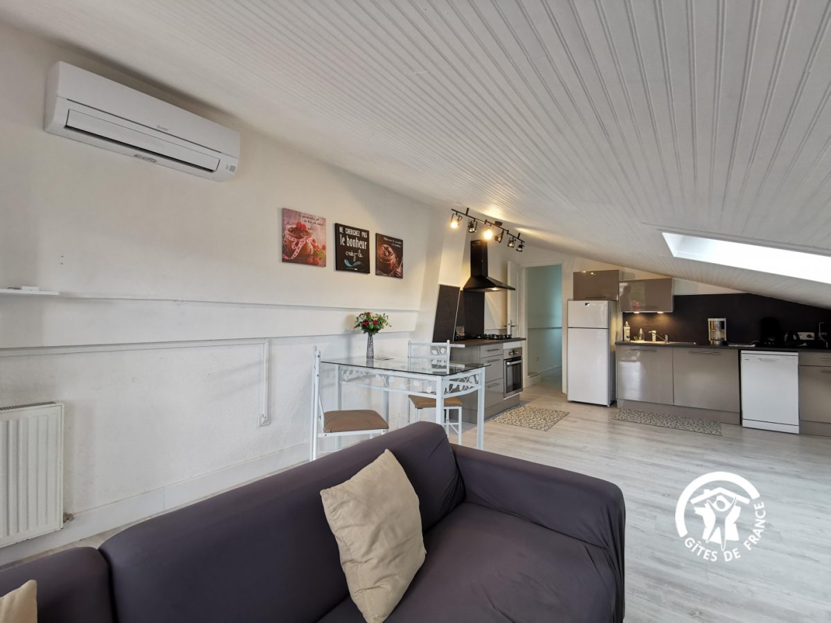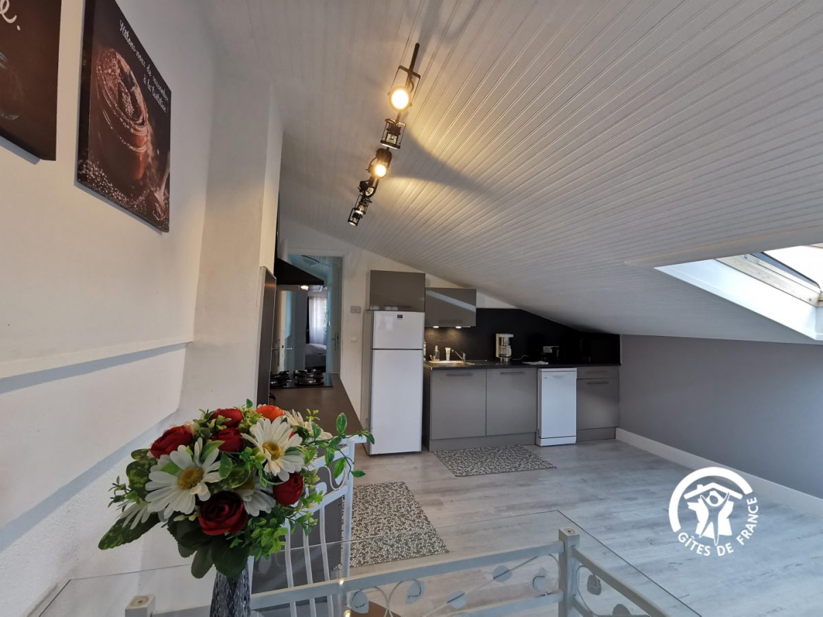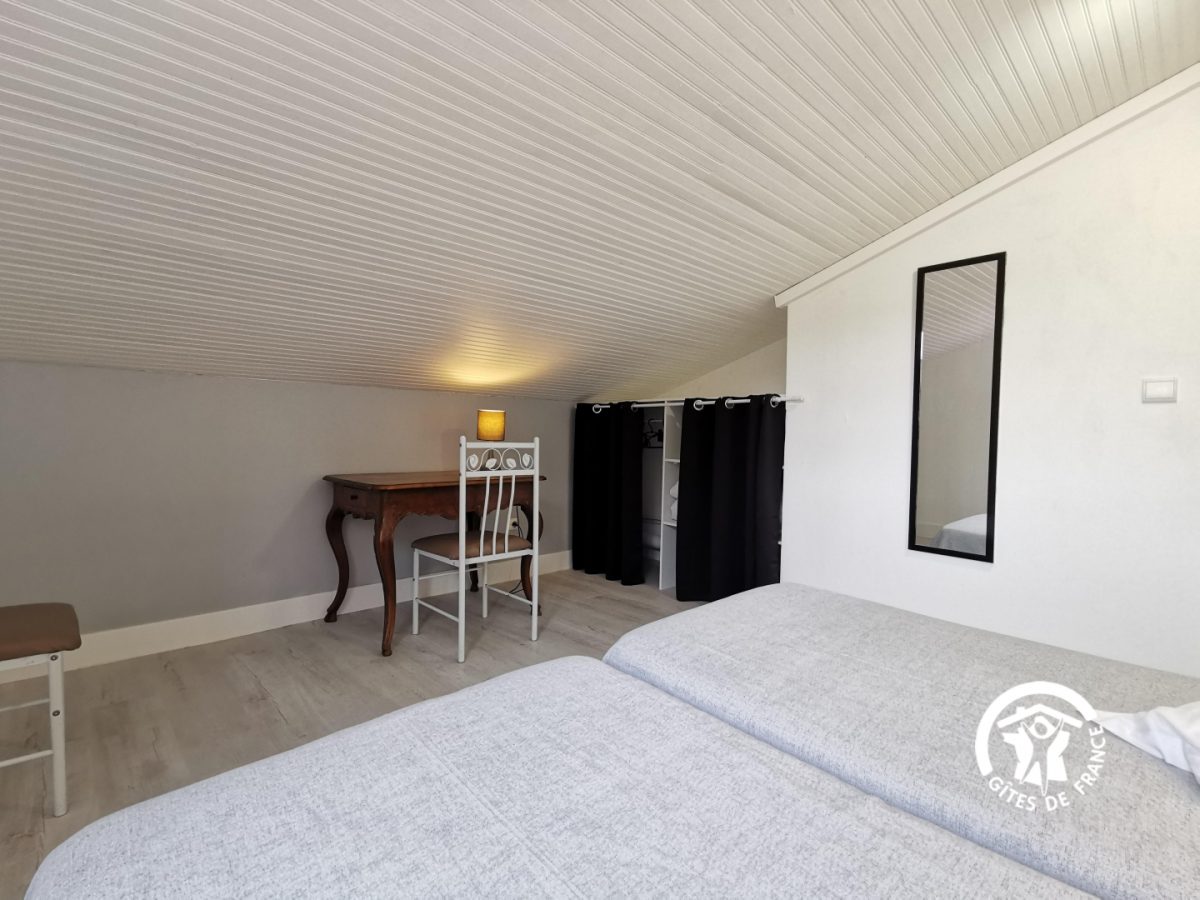 Ce gîte pour 2 personnes est au 1 étage, sous les toits en sous-pentes : séjour avec coin cuisine équipée, 1 chambre (2 lits 1 pers), salle d'eau, wc. Une petite terrasse privative permet de déjeuner face aux Pyrénées. Une piscine chauffée est à partager avec les 2 autres gîtes (dimensions : 11 x 5 m – sécurisée par une clôture). Le site est entouré de garrigue et au calme.