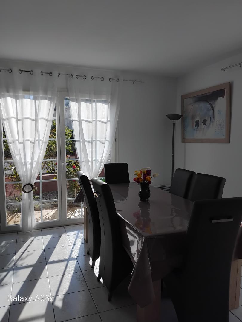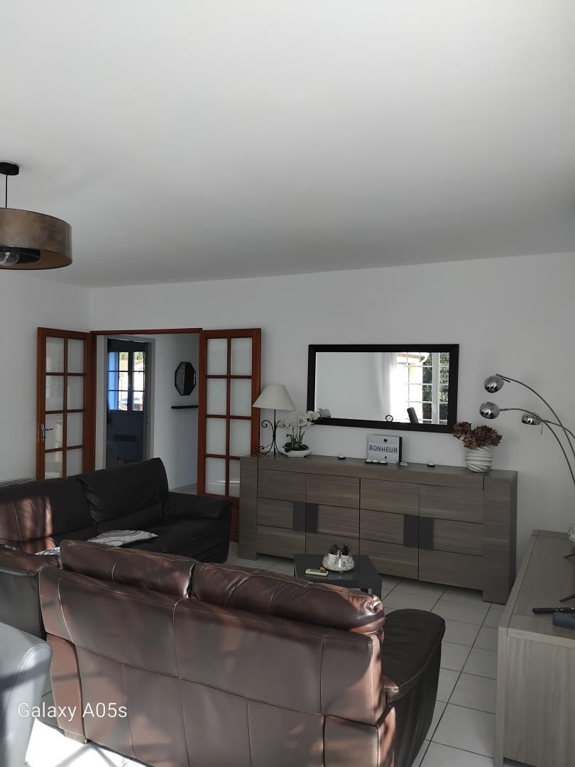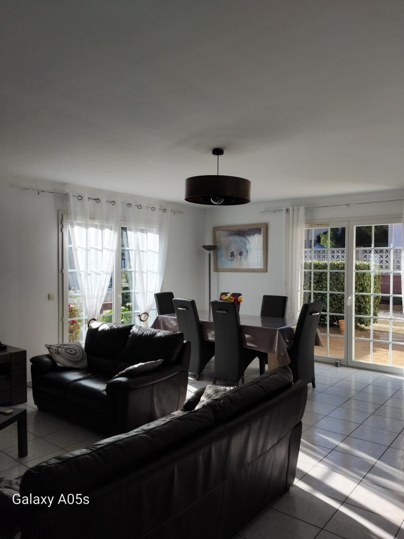 Grand séjour climatisé avec salle à manger donnant sur la terrasse et le jardin clos arboré et fleuri de 450 m²