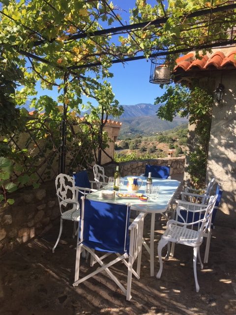 Il y a 3 chambres, une salle de bain familiale, une salle d'eau et 2 WC séparés. Il y a également un couchage d'appoint (pour 2 personnes) très confortable dans le salon. Il y a deux terrasses, une couverte de vignes est directement à l'extérieur de la salle à manger, et une autre donnant sur la piscine et les montagnes avec un barbecue à gaz et un évier.