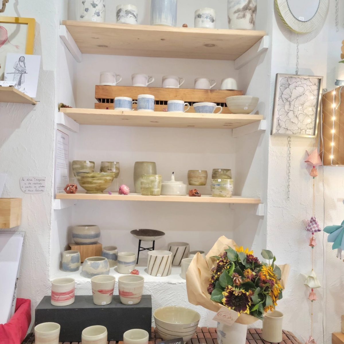 Boutique de créatrices et créateurs (artisanat local) avec un choix de bijoux, couteaux, papeterie illustrée...